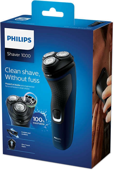 Afeitadora Serie 1000, sistema cuchillas PowerCut Cabezales pivotantes 4 direcciones, facil limpieza (one touch open), 40min autonomia con 8h de carga, bateria nimh uso con y sin cable