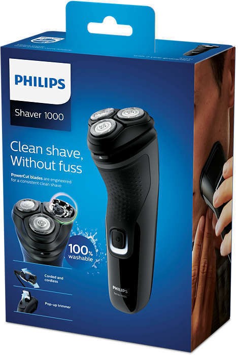 Autonomía (min): 40; Limpieza con agua; Alimentación: A red / batería recargable; Tipo de batería: Ni-MH; Tapa protectora; Grado de protección: IPX7; Número de cuchillas: 27; Afeitado en seco; Voltaje automático; Mango ergonómico antideslizante; Cuchillas autoafilables; Tiempo de carga (h): 8; Cuchillas PowerCut; Se abre con un toque; Indicador de nivel de batería; Cabezales flexibles en 4 direcciones; Cortapatillas desplegable; Web: https://www.philips.es/c-p/S1231_41/shaver-1200-afeitadora-electrica-en-seco-series-1000;; Afeitadora Serie 1000, sistema cuchillas PowerCut Cabezales pivotantes 4 direcciones, facil limpieza (one touch open), 40min autonomia con 8h de carga, bateria nimh uso con y sin cable, con cortapatillas integrado