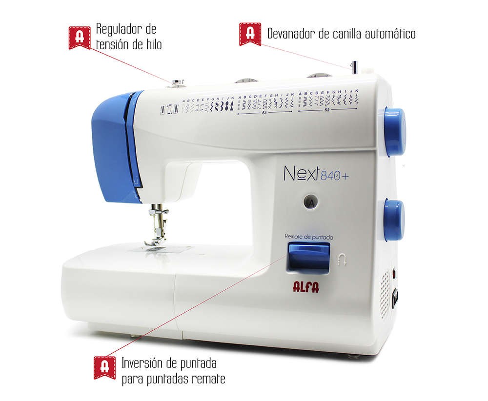 34 Diseños de puntadas, 6 filas de dientes de arrastre, doble altura de prensatelas para tejidos gruesos, devanador de canilla automatico, cortador de hilo, luz led.