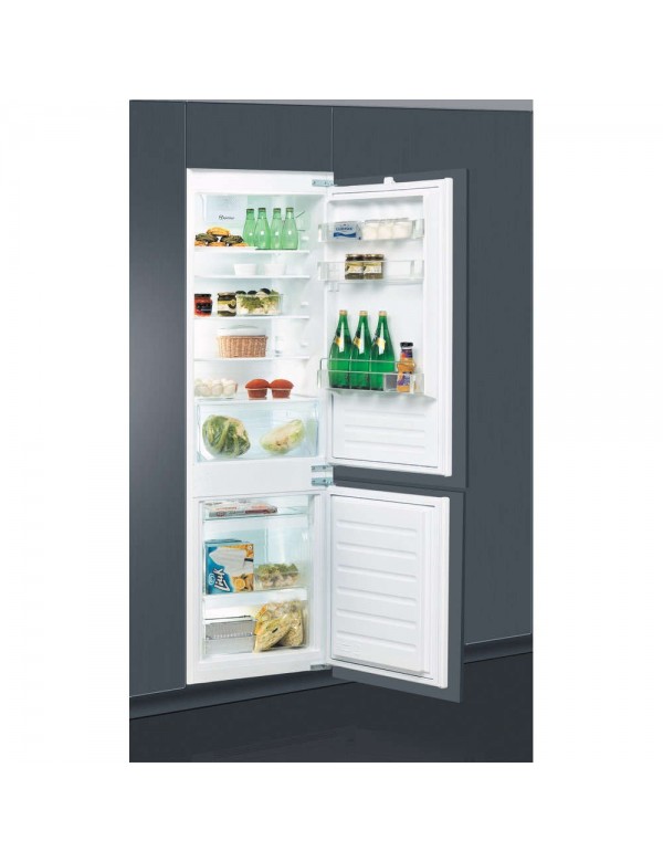 Clasificación energética nueva: E; Color: Blanco; Capacidad total (L): 273; Capacidad del frigorífico (L): 194; Capacidad del congelador (L): 79; Capacidad de congelacion (kg/24h): 4; Instalación: Integrable; Apertura reversible de puertas; Autonomía congelador sin corriente (h): 19; Nivel de ruido (dB): 35; Número de cajones cerrados congelador: 3; Peso (Kg): 50,6; Tipo de bandejas frigorífico: De cristal; Número de estrellas: 4; Descongelación: Automática en frigorífico y manual en congelador; Tensión (V): 220 - 240; Potencia (W): 140; Frecuencia (Hz): 50; Número de bandejas del refrigerador: 5 (4 regulables); Balcón para botellas; Tecnología LessFrost; Luces LED; Cajón FreshBox; Número de zonas de temperaturas: 2; Separador de botellas; Control electrónico; Web: https://www.whirlpool.es/productos-1/frigor%c3%adficos-3/frigor%c3%adfico-combinado-de-encastre-whir; Web 2: lpool-art-66102/859991609600/; Ventilador interior; Alarma mal funcionamiento;; Color White | Inteligencia 6th Sense | Tipo de Control Electronic | Eficiencia E nergética A++ | Eficiencia NEL E | Número de Balcones 3 | Número de Bandejas Aju stables 4 | Capacidad neta congelador (L) 79 | Capacidad neta frigorífico (L) 19 4 | Capacidad Neta Total (L) 273 | Nivel de Ruido (dBA) 35 | Consumo Anual de En ergía(kWh/año) 233 | Dimensiones de Producto 1770x540x545 mm|Dimensiones de Prod ucto Empaquetado 1840x580x608 mm