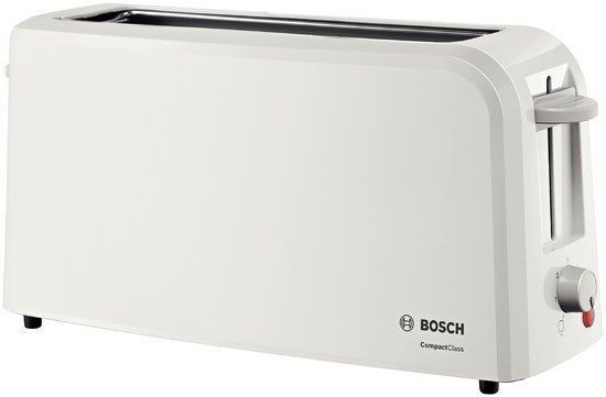 Potencia (W): 980; Número de ranuras: 1 extra ancha; Pulsador Stop / Eject; Bandeja recogemigas; Calienta panecillos; Recogecable; Centrado automático; Desconexión automática en caso de atasco; Desconexión automática en caso de vuelco; Tensión (V): 220-240; Frecuencia (Hz): 50-60; Sensor electrónico para tostado uniforme; Web: http://www.bosch-home.es/productos/desayuno/tostadores/TAT3A001.html?source=search;; 1 Boca extragrande, 980W, Bandeja recogemigas, Blanco