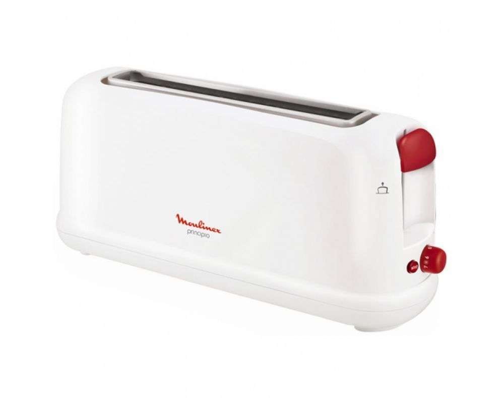Potencia (W): 840 – 1.000; Número de ranuras: 1 larga (2 rebanadas); Niveles de potencia: 7; Función descongelación; Sistema extra-elevación; Bandeja recogemigas; Recogecable; Centrado automático; Color: Blanco / rojo; Piloto de funcionamiento; Regulador del grado de tostado; Botón Stop; Web: http://www.moulinex.es/Desayuno/Tostadores/PRINCIPIO-1-RANURA-LARGA/p/7211002508;; Principio 1 Ranura Larga